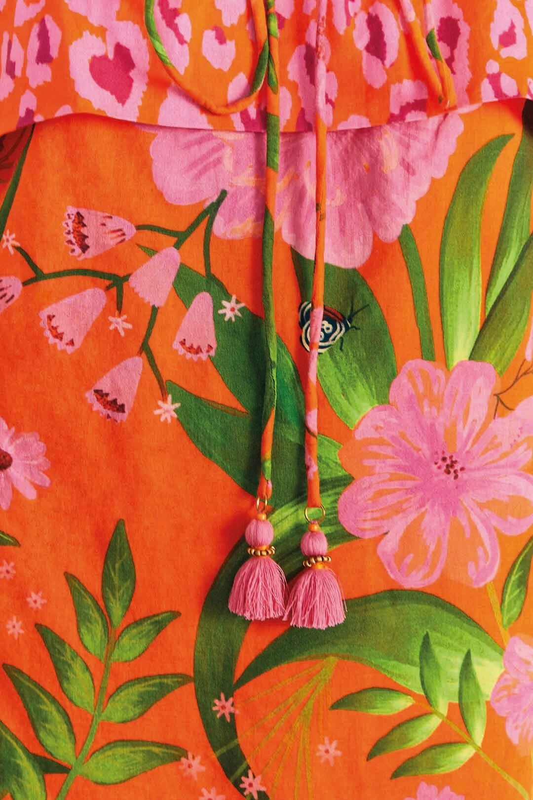 - Strapless neckline with ties and tassels