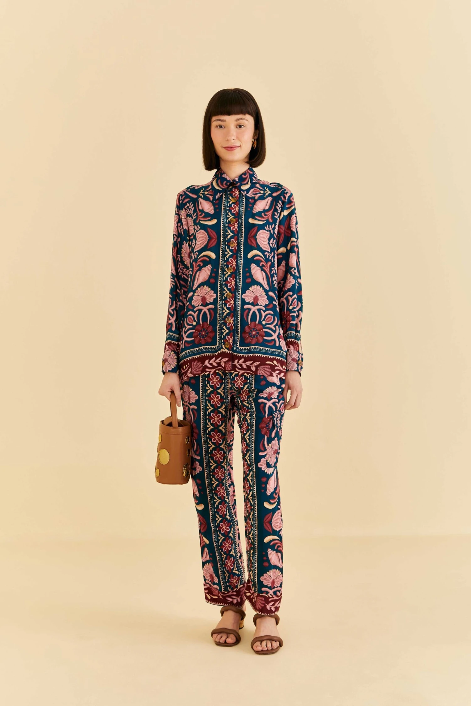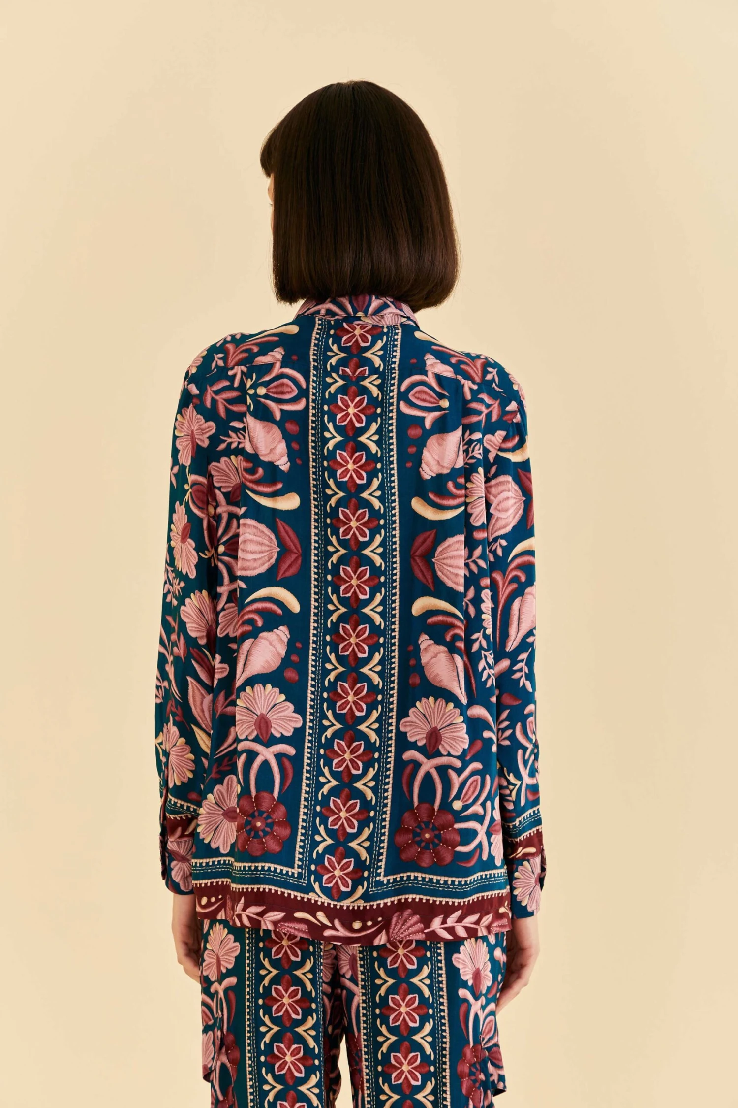 Tropically sophisticated — that’s what best describes how you’ll look while wearing the Teal Seashell Tapestry Shirt. This fancy-yet-cool tailored top has a sea-inspired arabesque print, with a center-front button placket and buttons at cuffs. You can adjust the piece to your mood and match it with all your wardrobe staples, from your everyday